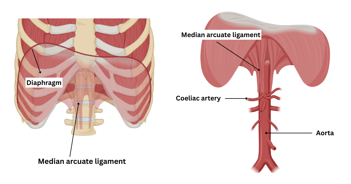 The median arcuate ligament is a band of tissue under the diaphragm that connects the diaphragm to the spine.1 The coeliac artery is a blood vessel that supplies blood to multiple upper abdominal organs (such as the gastrointestinal tract, liver and spleen), and normally sits below the median arcuate ligament.5,6